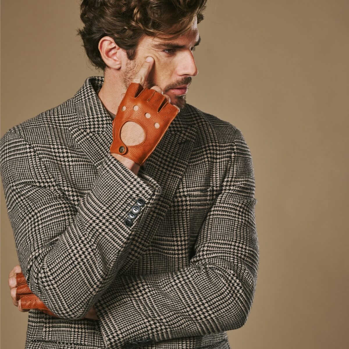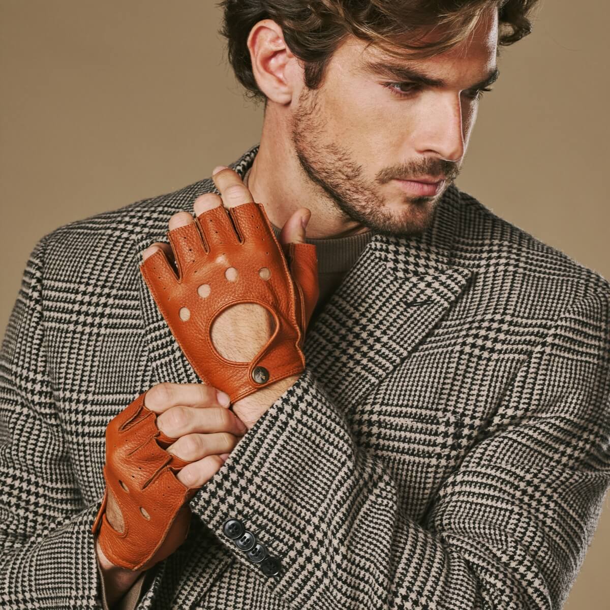 Zane (cognac) – Luxurious men's fingerless driving gloves made of American deerskin leather